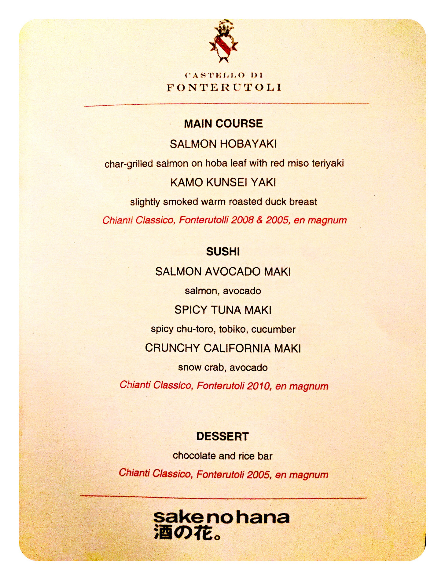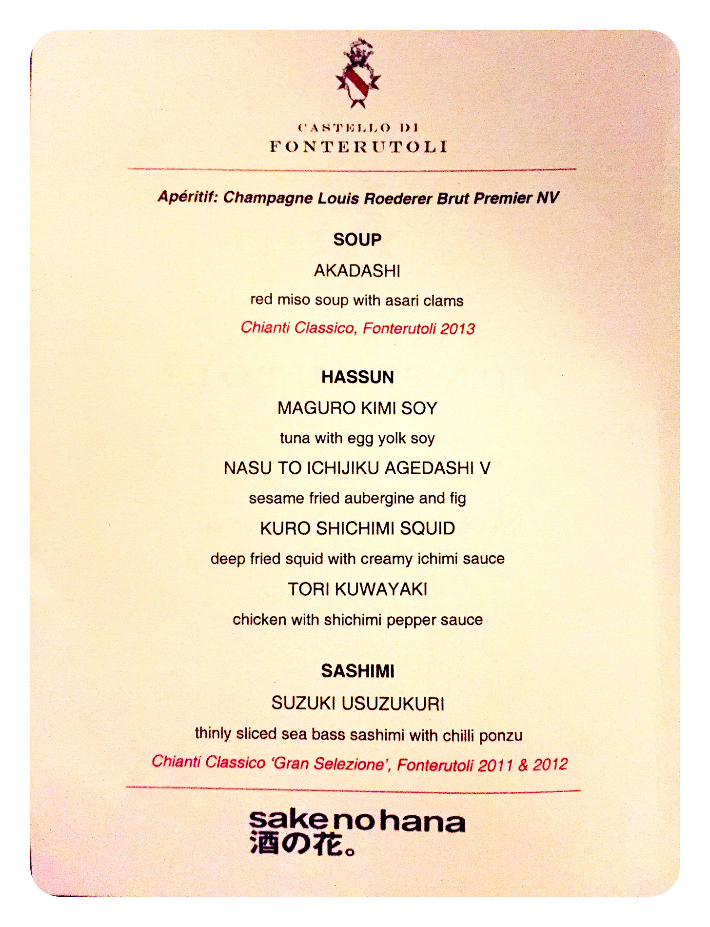 Castello Fonterutoli Gran Selezione Chianti Classico 2012 Pairing a number of lovely Chianti Classico wines with Japanese food might not seem an obvious choice but the synergy between the tertiary flavours of the older wines and the savoury components of the food, worked amazingly well. An inspired choice.